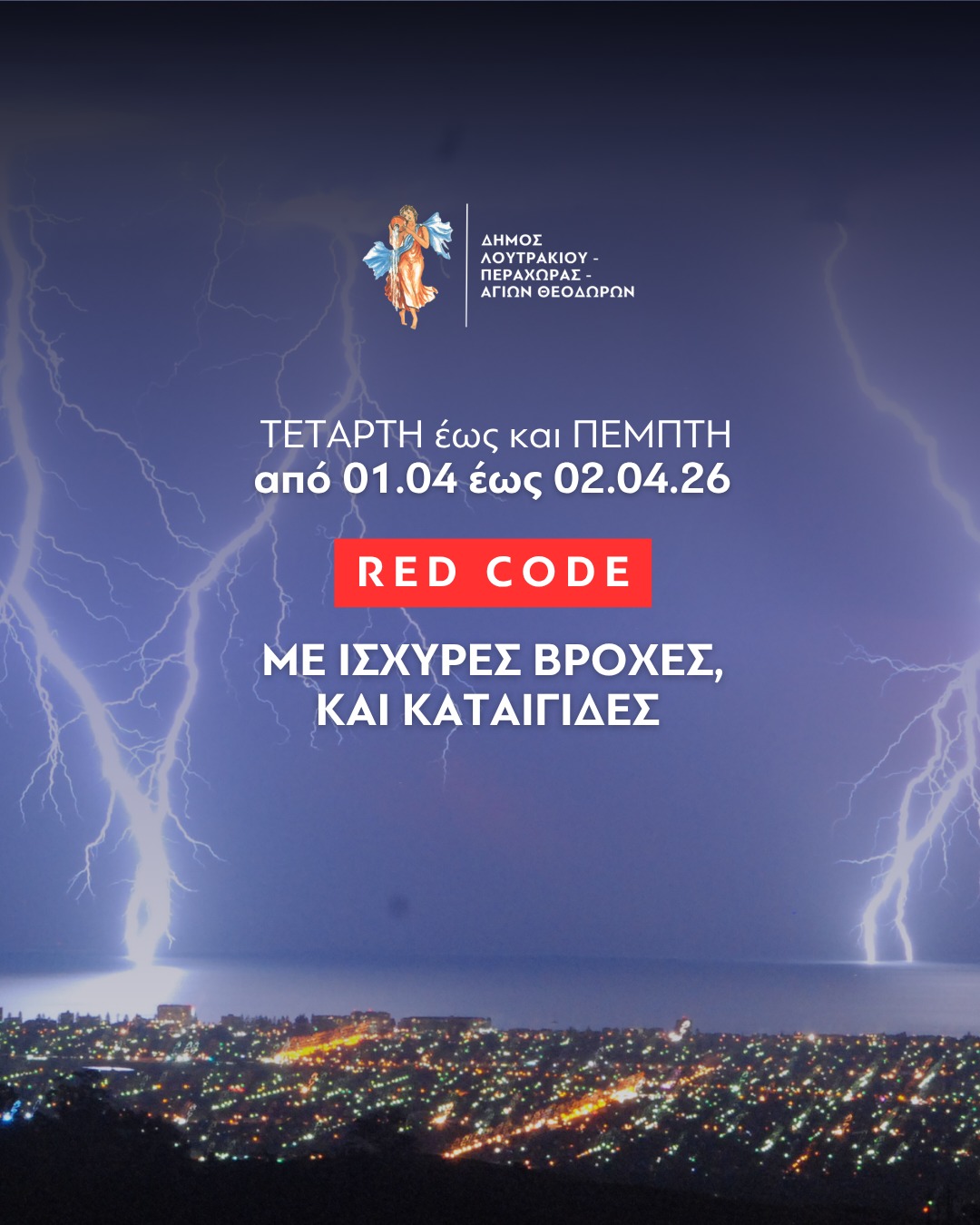 Σύμφωνα με την υπ’ αρ. πρωτ. Α1216 / 31-03-2026 (ΑΔΑ: 98ΝΕ46ΝΠΙΘ-ΚΨΗ) Απόφαση του Γενικού Γραμματέα Πολιτικής Προστασίας και ...λαμβάνοντας υπόψη τα Δελτία Πρόγνωσης Καιρού της Ε.Μ.Υ., η Περιφέρεια Πελοποννήσου και ο Δήμος Λουτρακίου - Περαχώρας – Αγίων Θεοδώρων, τίθενται σε κατάσταση κινητοποίησης (Red Code) από αύριο, Τετάρτη 01.04.2026 έως και την Πέμπτη 02.04.2026, καθώς προβλέπεται ισχυρός κίνδυνος εκδήλωσης πλημμυρικών φαινομένων, καθώς και παράκτιων πλημμυρών λόγω των θυελλωδών ανέμων.