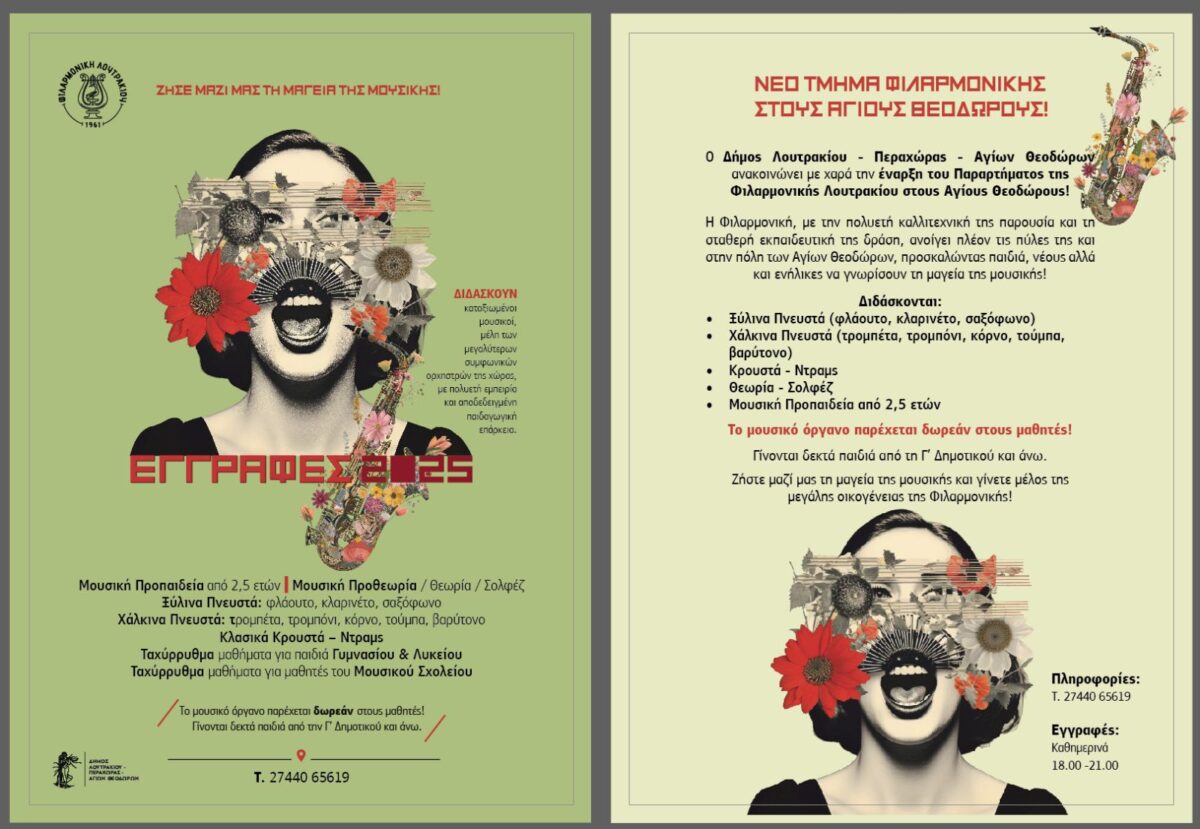 Στο πλαίσιο της διαρκούς προσπάθειας του Δήμου Λουτρακίου – Περαχώρας – Αγίων Θεοδώρων για την ενίσχυση της πολιτιστικής ζωής και της μουσικής εκπαίδευσης, ανακοινώνεται η ίδρυση Παρατήματος της Φιλαρμονικής στους Αγίους Θεοδώρους.
