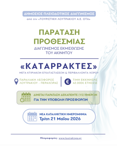 Η «ΤΟΥΡΙΣΤΙΚΗ ΛΟΥΤΡΑΚΙΟΥ Α.Ε. ΟΤΑ» προκηρύσσει δημόσιο πλειοδοτικό διαγωνισμό για την εκμίσθωση του τουριστικού ακινήτου «Καταρράκτες», στο Λουτράκι. Το ακίνητο βρίσκεται στην παραλιακή λεωφόρος Λουτρακίου – Περαχώρας Τιμή εκκίνησης: 42.000 € [...]