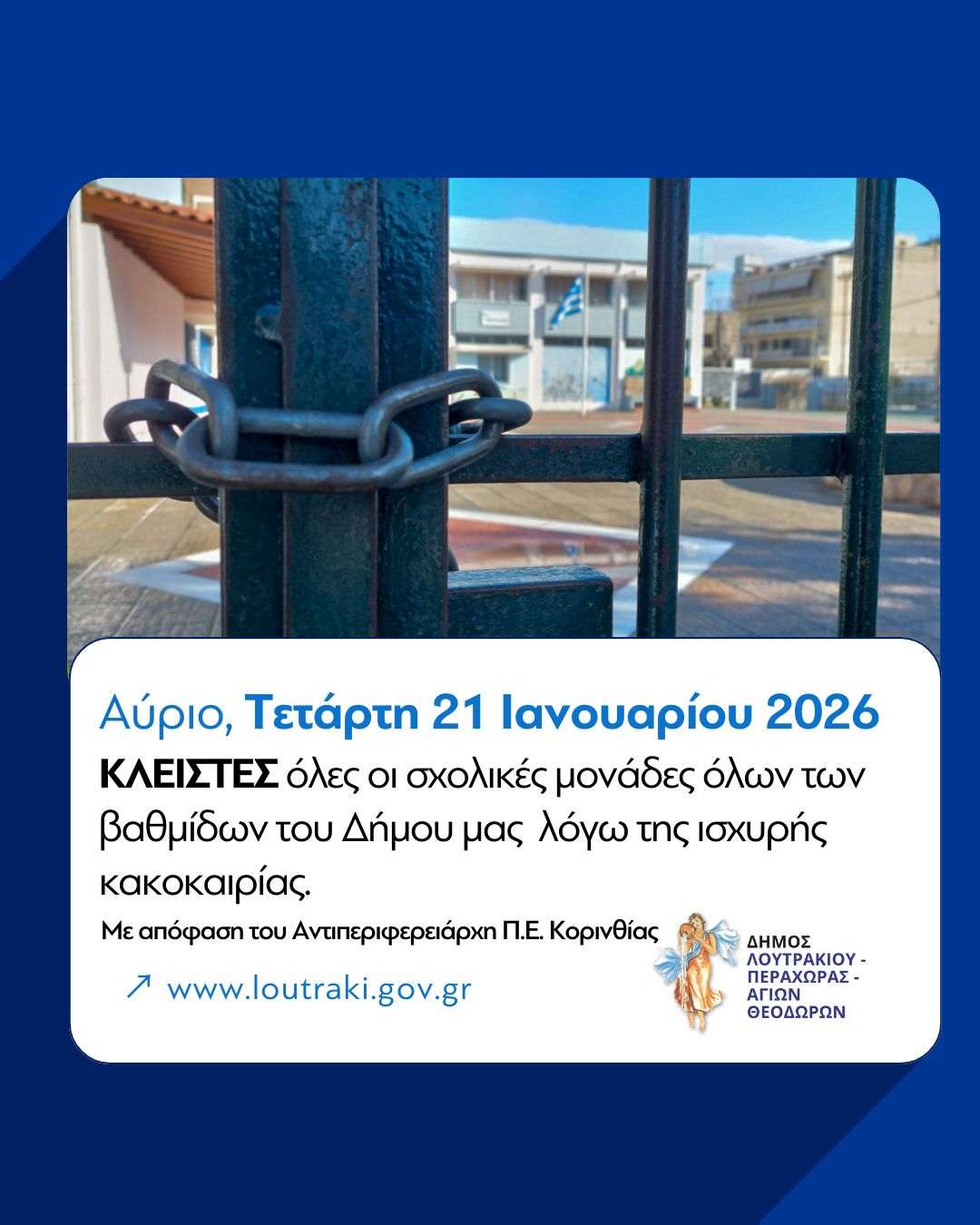 Με απόφαση των αρμόδιων Αντιπεριφερειαρχών και κατόπιν εισήγησης των μελών της Επιτροπής Εκτίμησης Κινδύνου, της Πολιτικής Προστασίας και της ΕΜΥ, κλειστά θα παραμείνουν για προληπτικούς λόγους αύριο, Τετάρτη 21 Ιανουαρίου, όλα τα σχολεία Πρωτοβάθμιας και Δευτεροβάθμιας Εκπαίδευσης, καθώς και οι κοινωνικές δομές, στις Περιφερειακές Ενότητες Αργολίδας, Κορινθίας και Λακωνίας.