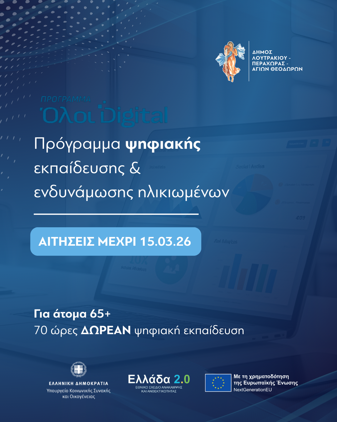 Ο Δήμος Λουτρακίου – Περαχώρας – Αγίων Θεοδώρων εντάχθηκε στο χρηματοδοτούμενο πρόγραμμα του Υπουργείου Κοινωνικής Συνοχής και Οικογένειας με τίτλο «Ψηφιακή Εκπαίδευση και Ενδυνάμωση των Ηλικιωμένων και των Ατόμων με Αναπηρία». Το πρόγραμμα υλοποιείται με την υποστήριξη του Υπουργείου Ψηφιακής Διακυβέρνησης, φορείς υλοποίησης το Εθνικό Δίκτυο Υποδομών Τεχνολογίας και Έρευνας Α.Ε. (Ε.Δ.Υ.Τ.Ε.) και το Ινστιτούτο Εθνικής Συνομοσπονδίας Ατόμων με Αναπηρία και Χρόνιες Παθήσεις Α.Μ.Κ.Ε. (ΙΝ.Ε.Σ.Α.μεΑ) και χρηματοδότηση από το Εθνικό Ταμείο Ανάκαμψης και Ανθεκτικότητας «Ελλάδα 2.0».