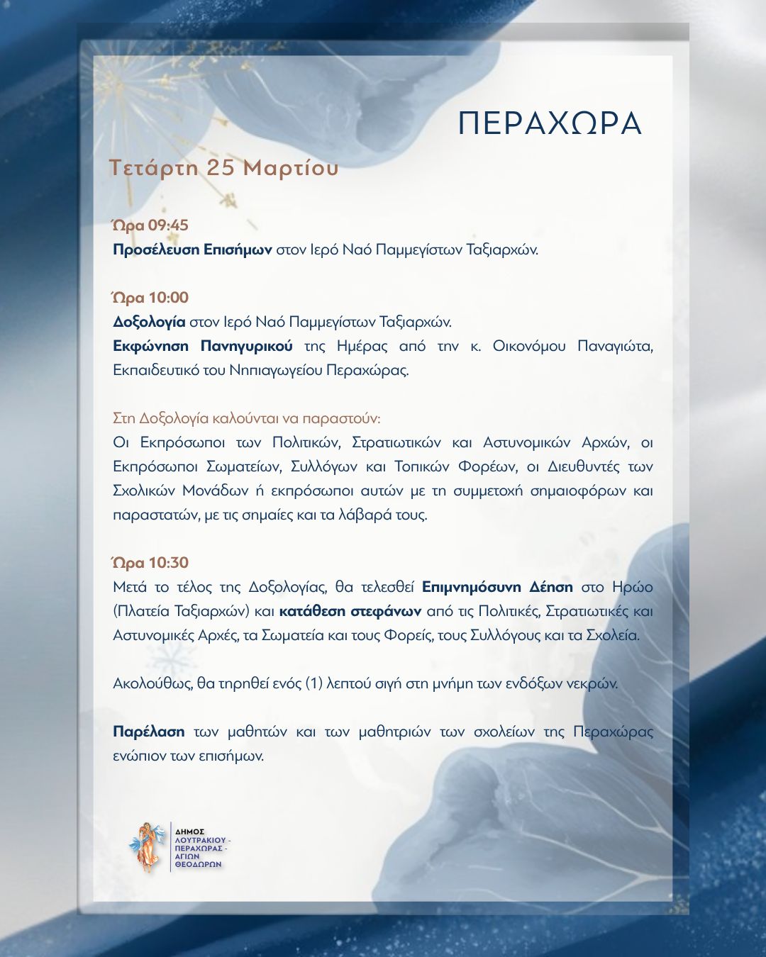 Πρόσκληση Εορτασμού Εθνικής Επετείου 25ης Μαρτίου 1821 (2026) View Larger Image Ηλεκτρονικό αρχείο:Λήψη αρχείου / Προβολή αρχείου loutraki 2026-03-20T13:43:55+00:00 March 20th, 2026|, Νέα, Συμαντικά| Share This Story, Choose Your Platform! FacebookTwitterLinkedinRedditTumblrGoogle+PinterestVkEmail