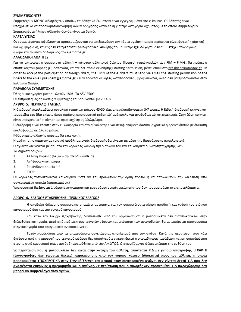 - Αν και η διαδρομή θα είναι κλειστή στην κυκλοφορία, οι μοτοσυκλέτες motocross δεν θα γίνονται δεκτές, ενώ επιτρέπεται η συμμετοχή μοτοσυκλετών enduro και adventure.